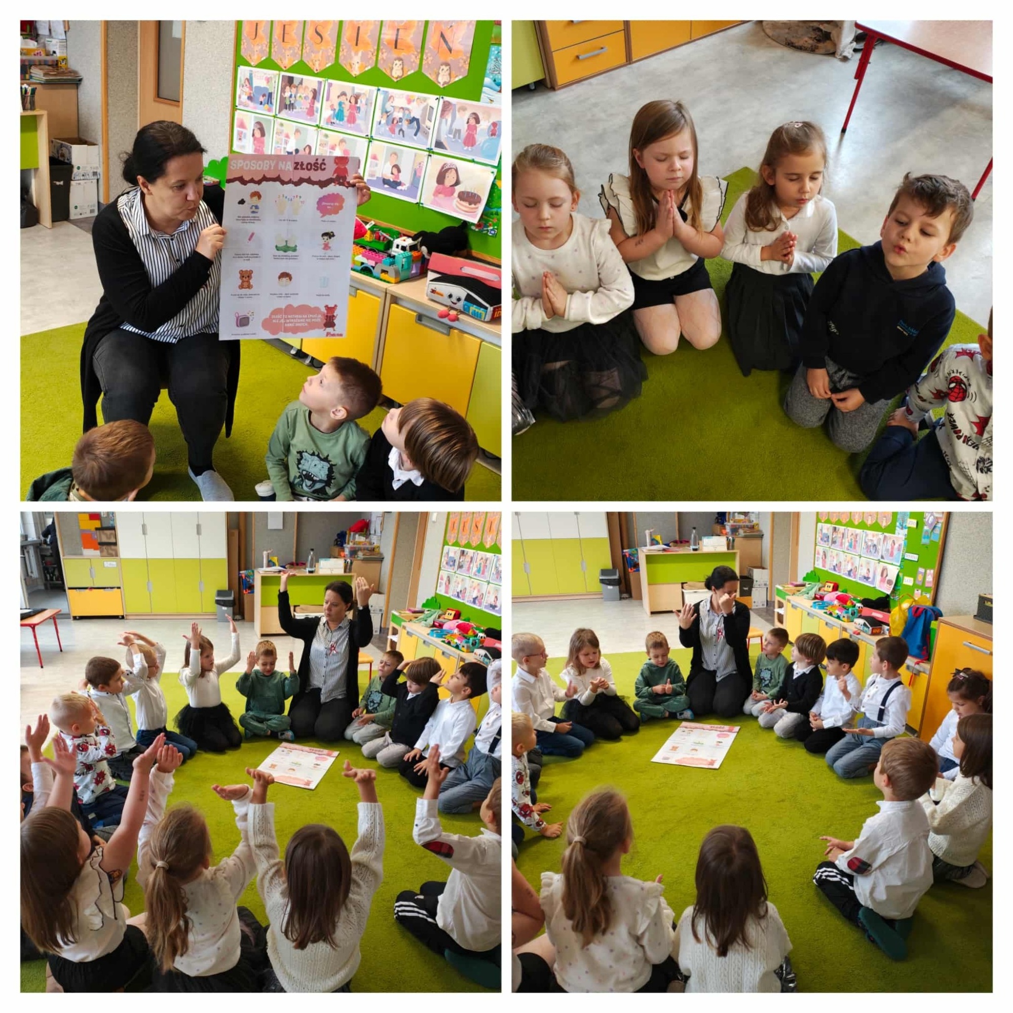 Podczas zajęć dzieci z grupy Kotków wysłuchały opowiadania, rozmawiały o tym, kiedy czują złość i jak można ją rozpoznać po zachowaniu oraz po reakcjach ciała. Wspólnie z panią psycholog przedszkolaki uczyły się, jak w bezpieczny sposób wyrażać złość. Zajęcia miały formę zabawy, rozmowy i ćwiczeń ruchowych, dzięki czemu dzieci aktywnie uczestniczyły w każdym etapie spotkania. Spotkanie dostarczyło wielu cennych doświadczeń i pomogło przedszkolakom lepiej zrozumieć własne emocje.