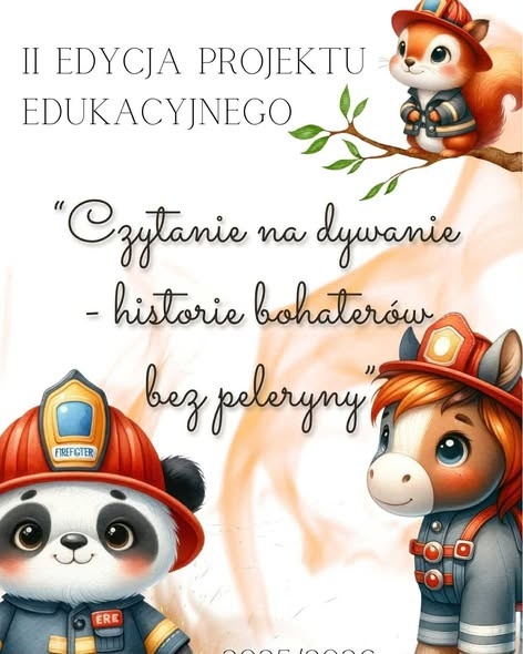 bierze udział w II Edycji Projektu Edukacyjnego „Czytanie na dywanie - historie bohaterów bez peleryny”. Dzieci wysłuchały pierwszej historii pt. : „Umiejętności wspinaczkowe strażaka Henia”, która zainspirowała do rozmowy na temat odwagi, determinacji i pracy zespołowej. Dzieci opowiadały o swoich mocnych stronach, co pomoże im w budowaniu pewności siebie. Dzisiejsza historia odważnego strażaka przypomniała rownież dzieciom, że każdy z nas ma w sobie coś wyjątkowego .Na koniec pierwszego zadania wiewiórki wykonały ćwiczenie grafomotoryczne oraz wcieliły się w rolę strażaka Henia