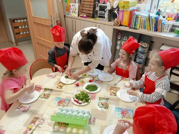 - Wprowadzanie dzieci w świat kulinariów w sposób bezpieczny i angażujący – poprzez proste czynności kuchenne (np. przygotowywanie przekąsek, poznawanie składników, zapachów i smaków sezonowych).